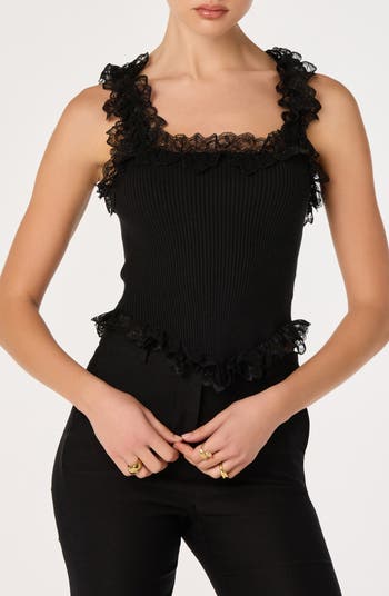 Fluttery ruffled lace trims the entirety of this fitted ribbed tank designed with a curved hem that brings the look a corset-like charm.