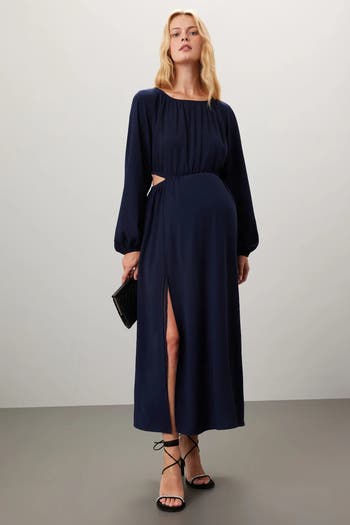 this gown offers both comfort and class. The unique cut-out at the waist area not only flatters your growing bump but also adds a contemporary twist to traditional maternity wear. Long sleeves provide a graceful touch, ensuring you feel confident and radiant.