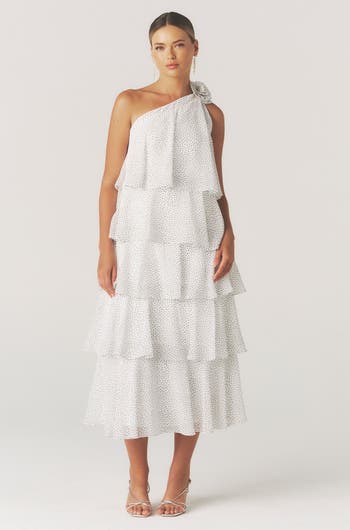 The AMORA Tiered Polka Midaxi Dress gives the ultimate femininity in a standout silhouette. With soft touch chiffon fabric in a micro polka print, its layered tiers and asymmetric neckline create a femme outline with an on-trend finish. The premium design is wearable for both high occasions and summer days. The removable corsage can be worn around the neck or as a feature on the dress.