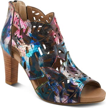 A hand-painted pattern and geometric cutouts further the bold look of this lightly cushioned stacked-heel sandal.