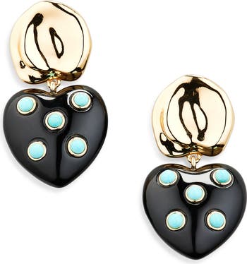 Dark resin hearts are brightened by turquoise cabochons on these lovely heart drop earrings.