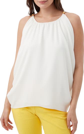 Sleeveless drapey blouse with an adjustable drawstring neckline, gold hardware detail at the shoulders and draping detail below the armholes