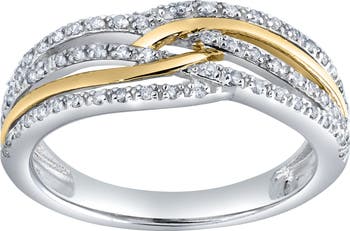 Radiant and modern this diamond ring features 0.20 carats of natural diamonds set in polished 10K gold with a sleek ribbon detail through the center. The graceful crossover bands are lined with shimmering pave diamonds for a layered two tone look that catches the light from every angle. Perfect for everyday wear or special occasions it adds refined sparkle to any stack or stands beautifully on its own. Expertly crafted with ethically sourced natural diamonds. Diamond carat weight may vary up to 0.05 carats from the stated weight.