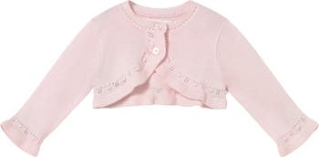 A soft and elegant layer designed with delicate detailing, perfect for keeping little ones cozy while adding charm to their outfit. Its gentle finish makes it suitable for both everyday wear and special occasions. Long sleeves with subtle flare and eyelet pattern for texture. Scalloped front edge with button closure near the neckline.