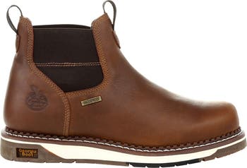The classic wedge silhouette with upgraded comfort and performance. That's what you get with the Georgia Boot AMP LT Wedge Waterproof Chelsea Work Boot. Some things never change. We still craft our wedges with the tried and true SPR leather. It's three times stronger and two and half times more abrasion resistant than traditional leathers. Nylon pull tabs and twin gore panels allow for an easy slip on of this Chelsea style wedge boot and ensure a great fit. The padded counter pocket provides additional support in the heel area while the removable AMP LT memory foam insole will wrap your feet in all day comfort. The interior is equipped with the Georgia Waterproof System, guaranteed to keep your feet dry when working in wet conditions. The foundation of this Chelsea boot contains a cushioning EVA midsole and fiberglass shank for additional support and stability. The outsole is engineered from our proprietary Carbo-Tec rubber. The special rubber blend has great heat, , abrasion and slip-resisting properties. The combination of the SPR leather and incredibly durable outsole makes the AMP LT Wedges a perfect boot for working in barnyard type of environments.