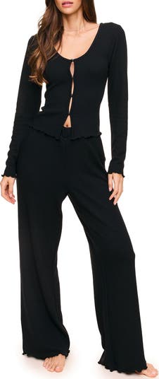 This lounge set includes a long sleeve top and pants set crafted from soft a rib knit fabric. It features flirty cut-outs and sweet heart buttons, combining playful detail with total comfort. The matching high waisted pants feature an elasticated waistband and pockets for everyday ease. Perfect for cozy nights in or lazy Sundays. (Available in sizes XS-XL.)
