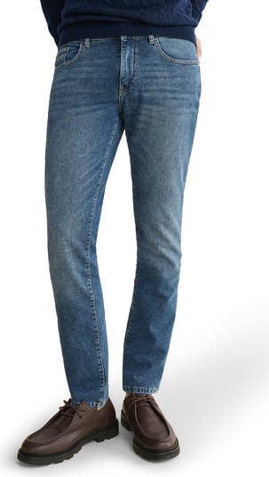 Slim and smart without being skinny, these jeans cut from a denim-effect cotton knit stretch and recover comfortably without bagging at the knees or sagging in the waist. Heavy fading and whiskering give them an old-favorite look and feel the first time you put them on.