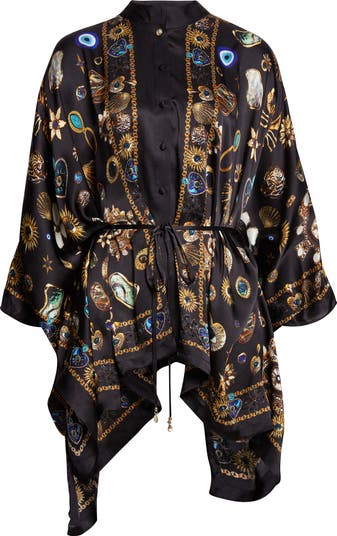 Camilla's signature crystals shimmer like scattered constellations across this lustrous silk-satin shirt in a limited-edition print of charms, chains and talismans inspired by the rich tradition of Turkish jewelry and the art of adornment. Gilded charms suspended from the matching belt complete the boho-eclectic look.