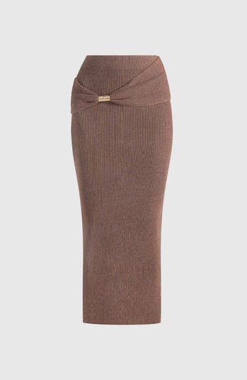 Crafted in soft high-stretch knitted fabric, this midaxi skirt features a fitted silhouette with a wrap over draped overlay that moves fluidly for a refined, elegant feel. A seamless waistband creates a smooth, polished profile, while a back slit detail enhances ease of movement and adds a modern edge. Finished with gold hardware accents for an elevated touch, it blends contemporary styling with timeless appeal.