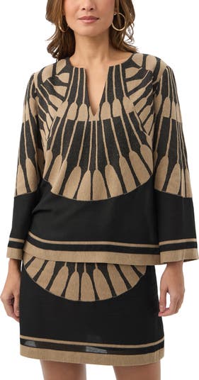 3/4 sleeve top with a split neckline, side slits and relaxed fit in a placed print