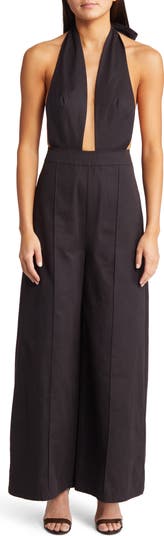 A plunging neckline and sweeping wide legs define the look of this statuesque jumpsuit finished with a chic halter tie neckline.