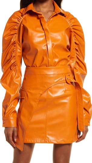 A utility aesthetic gets a sleek upgrade with faux leather and ruched puff sleeves to create this stunning shirt that's finished with a concealed snap front.