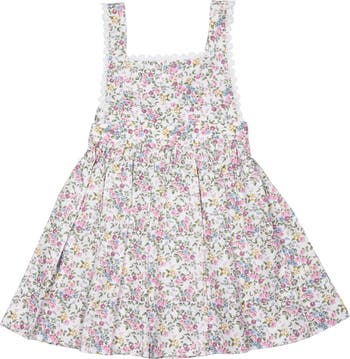 Our Ana Pinafore Dress is a lace trimmed baby girl outfit with a playfully elegant fit. This 100% Cotton dress features a fabric with a beautiful floral print. The petite flowers in this print are the sweetest shades of pink, yellow and blue. The lace trim detail gives this style a playful look. Heirloom quality made with the utmost care.