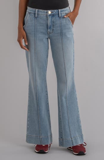 Vintage-inspired yet very of-the-moment, these stretchy flare jeans feature pintucked seams, slanted pockets and wide hems for trouser-inspired style.