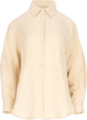 Button-up shirt with a classic collar, long sleeves, and subtle embroidered detail on the chest. Features a relaxed fit and a gently curved hem.