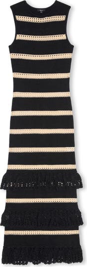Crochet-inspired stripes and ruffles at the skirt bring a more summery feel to this sleeveless midi dress knit from soft cotton-blend yarns.