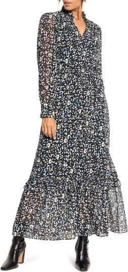 An abstract animal print enlivens the look of this gauzy long-sleeve dress complete with a ruffled skirt.