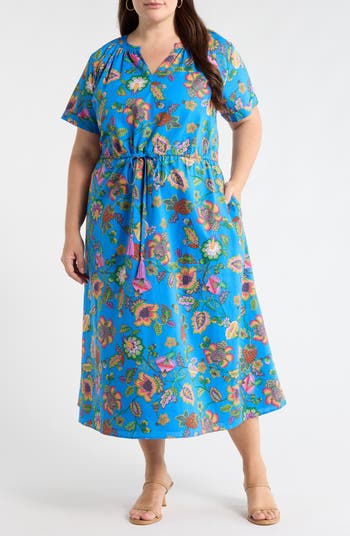 A playful tassel-capped waist tie, a vibrant floral print and breezy cotton make this midi an instant favorite for carefree days and relaxed evenings.
