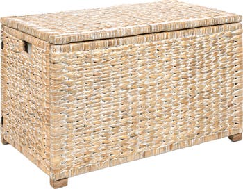- The finish on this woven water hyacinth trunk has an extravagant white wash color