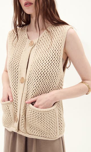 Extend sweater season with an open-stitch vest mostly made from lightweight cotton and perfected with a pair of pockets.