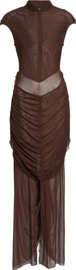 Inspired by both Eastern heritage and Western influences, this stretch-enhanced mesh dress featured on the spring '26 runway is designed with a sleek fitted bodice topped with a mandarin collar and framed by molded cap sleeves. A sheer midriff panel separates the bodice from the drapey drawstring-ruched skirt, which releases into filmy flyaway panels below. The eponymous designer creates bold, empowering looks, blending cultures and aesthetics into a signature style that speaks to multicultural and intersectional identities.