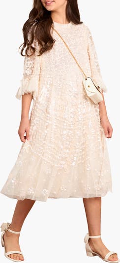 The Anais Sequin Kids Dress. Adorned with glistening sequins inspired by vintage lacework. With flutter sleeves and a full tulle skirt, this piece brings soft sparkle and elegance to any special occasion.