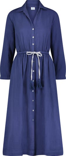 Beachy vibes meet borrowed-from-the-boys style with the Anais button front shirtdress. In a playful hibiscus shibori print, this soft cotton voile dress features a flattering drawstring waist and a spread collar.  Perfect from the sand to the table!  100% cotton gauze.