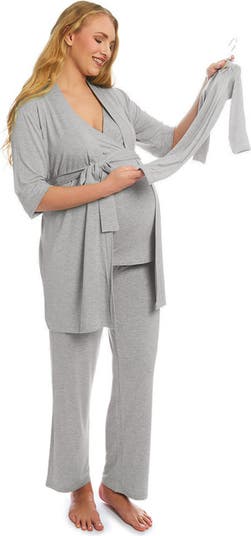This soft and stylish 5-piece gift is the perfect sleep and loungewear set for pregnancy, hospital and home. Mom's maternity/nursing top has cross-over chest that pulls aside for easy nursing, while the pant has a stretchy, smocked waistband that fits just under the belly. Throw on the 3/4-sleeve short robe as a stylish cover up when family and friends visit to see the newborn in a matching gown and hat!