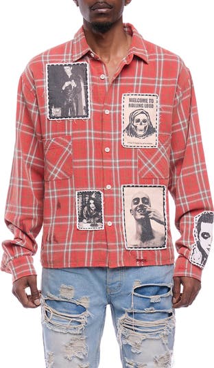Plaid cotton flannel brings OG-punk vibes to a shirt that's covered in threadbare patches celebrating the abstractions and oddities of living on the fringe. Wear it as an all-day top layer or throw it on as a lightweight jacket when you head out the door to bring color and energy to the world.