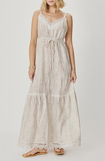 A slender tie sweetens the silhouette of this frill-trimmed sleeveless maxi covered in a subtle print and trimmed with lovely lace.