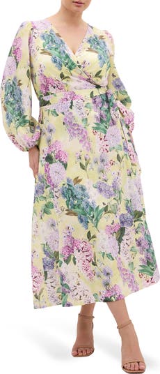 Blossoming hydrangeas stand out on this long-sleeve wrap dress made of lightweight fabric with softly crinkled texturing.