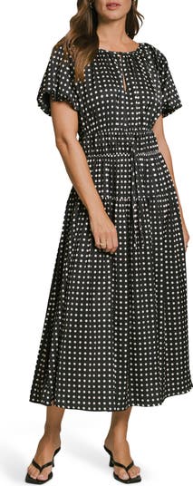Delightful puff sleeves and a flouncy flared skirt sweeten the silhouette of this tie-neck maxi covered in celebratory dots.