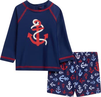Say 'ahoy' to your little matey with a long-sleeve rashguard paired with matching swim trunks.