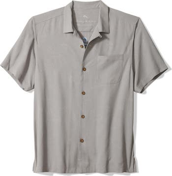 Leafy palm trees wave in pale jacquard and brilliant colors on a camp shirt featuring an embroidered boat, an emotional anchor and a relaxed, calming spirit. Made of cool Chinese silk, it takes you from enjoying the waves to relaxing in the shade in easy comfort.