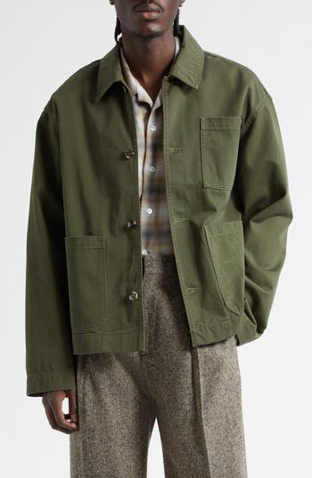 Signature anchor stitching nods to the Northern Ireland coastline where Anderson was raised on this boxy cotton-twill chore jacket backed by a leather patch edged using a technique borrowed from traditional Japanese bookbinding.