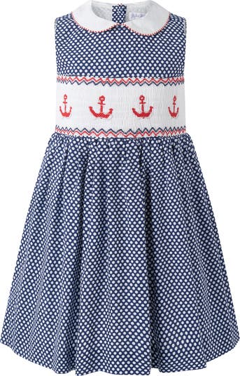 - The hand-smocked bodice features delicately embroidered red anchors framed by intricate stitching, adding a playful maritime touch. A crisp white Peter Pan collar with subtle red trim complements the design, while the softly gathered skirt creates a graceful, twirl-worthy silhouette.