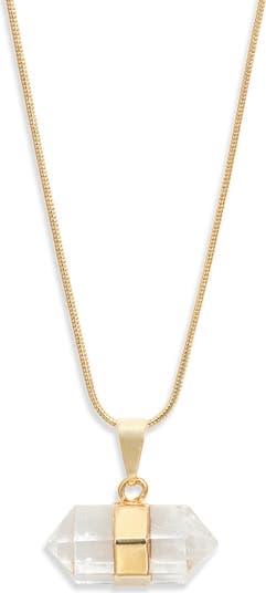This stunning pendant necklace features a light-reflecting quartz stone dangling from a gleaming snake chain with an 18-karat-gold overlay. Quartz is known as the 'master healer,' with the ability to amplify and absorb energies in physical or metaphysical spaces.