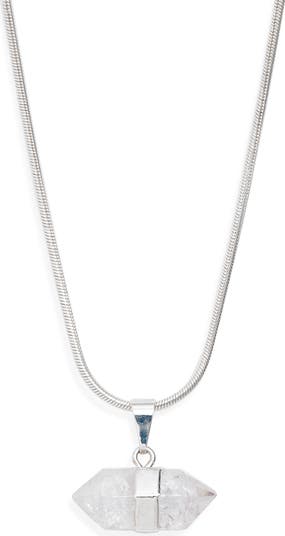 Bring a sense of ancient allure to your look with this shimmering snake-chain necklace adorned with a clear quartz point-stone pendant that subtly glows in the light.