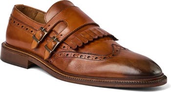 Brogue and fringe detailing amplify the classic style of a double monk-strap shoe fashioned from burnished Italian leather.