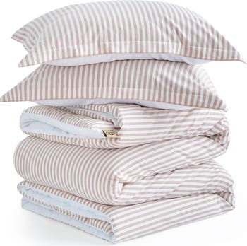 Made from soft, breathable cotton and warmed with lightweight fill, this set brings a classic look to your bedroom retreat with the softly hued stripes.