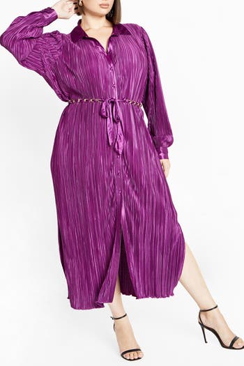 Side slits keeps the fit flowy and movement easy in this lightweight plissé shirtdress finished with satin trim and a chain-link belt.