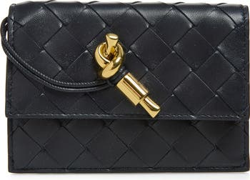 This slim card case in the label's handcrafted intrecciato weave features a secure zip compartment and metallic-knot hardware—a signature of the Andiamo line.
