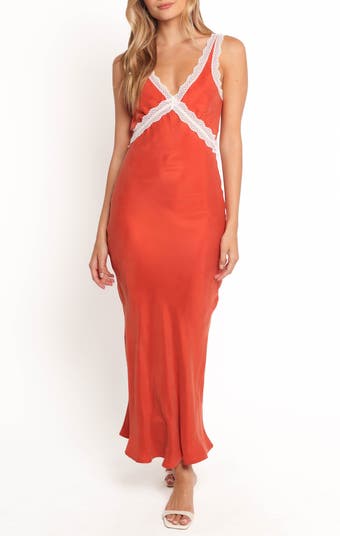 Lacy trim adds a touch of modern romance to this sleeveless dress shaped from smooth satin.