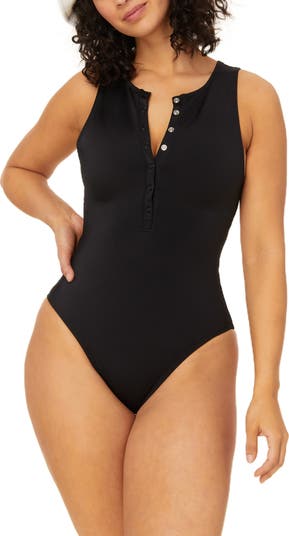 A half-snap placket lends sporty flair to this one-piece swimsuit.