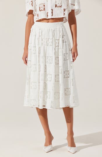 Floral lace amplifies the retro charm of a twirly midi skirt in a lightweight cotton weave.