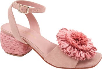 A raffia flower embellishment makes a delightful statement on an ankle-strap sandal lifted by a rounded heel with braided trim.