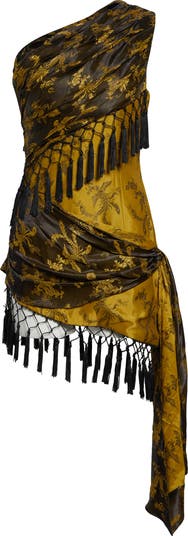 Inspired by both Eastern heritage and Western influences, this modern one-shoulder minidress featured on the spring '26 runway is cut from golden silk brocade patterned with twisting dragons and gliding phoenixes. The asymmetric panels and hemline showcase the drapey tassels suspended from net-like macramé knotting. The eponymous designer creates bold, empowering looks, blending cultures and aesthetics into signature style that speaks to multicultural and intersectional identities.