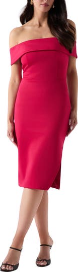 Serve sassy sophistication in a shoulder-showing dress crafted in soft scuba crepe and ready to be the topic of cocktail chatter.