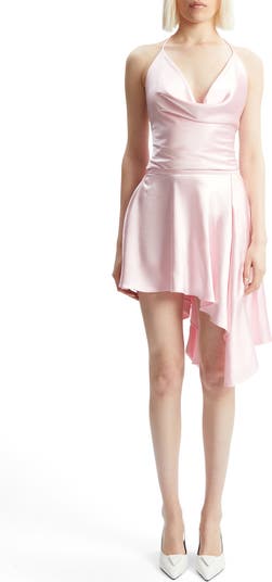 Elevate your going-out look in this skin-baring satin halter top featuring an elegantly draped cowl neckline, open back and jaunty tie closure.