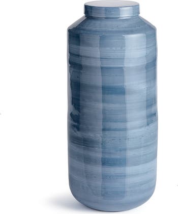 In a clever use of enameled iron, this lightweight ginger jar is painted by hand. A refined, horizontal swirl design, each one prettier than the next. With layers of delicate strokes in a coastal-inspired blue gray palette, it is modern artistry defined.